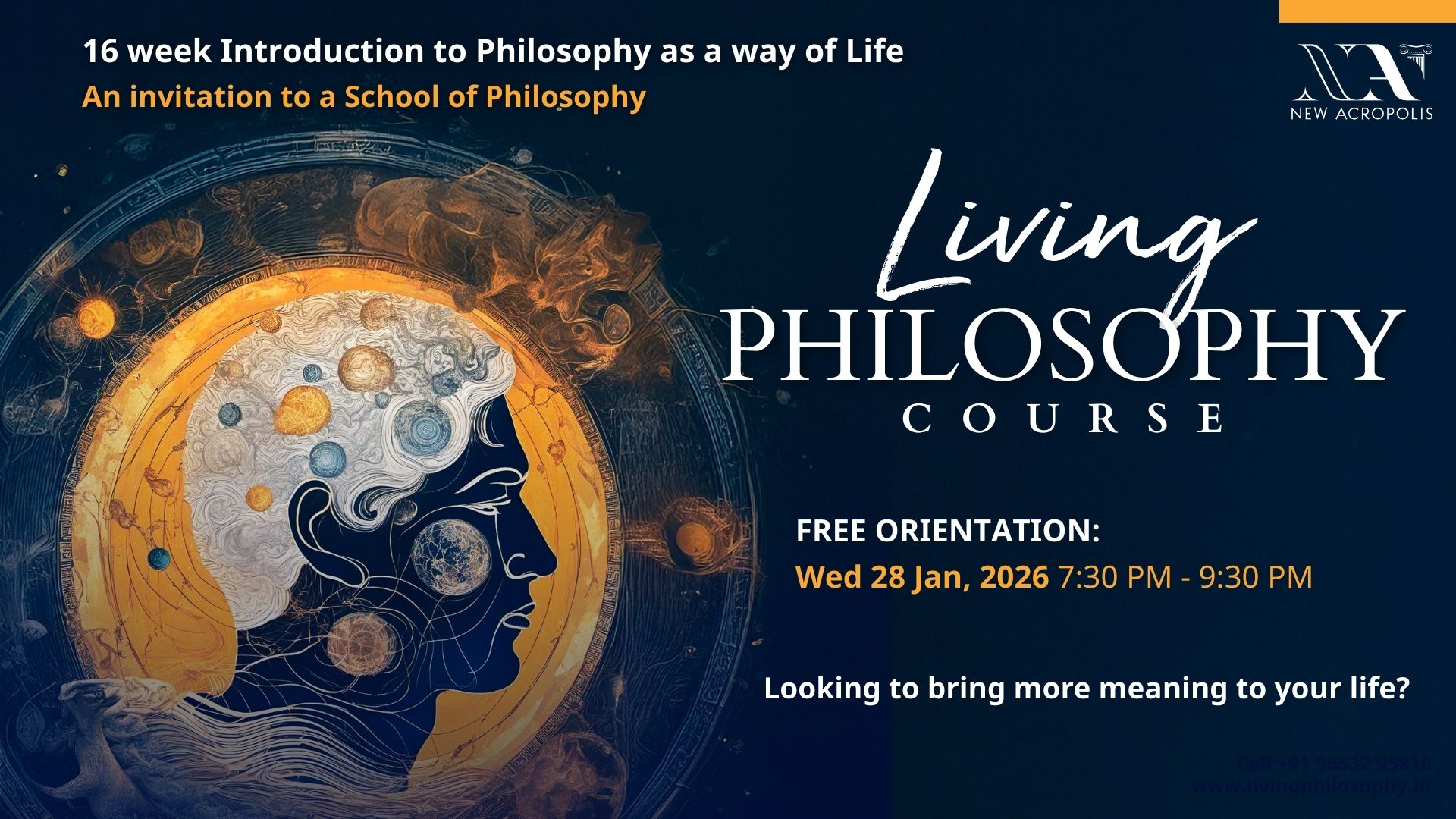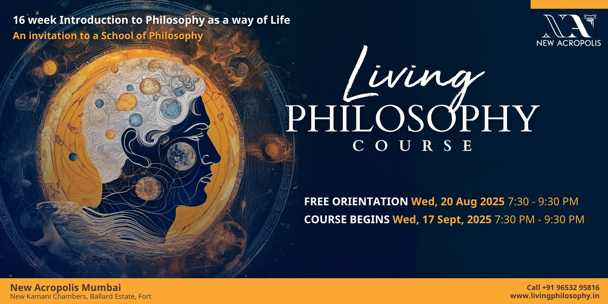 New Acropolis Mumbai Center New Acropolis Cultural Organization,4th Floor, New Kamani Chambers, Adi Marzban Path, Ballard Estate, Fort, Mumbai, Maharashtra, India16 week Introduction to Philosophy as a way of Life. An invitation to a School of Philosophy. This practical philosophy course acts as an introduction and foundation towards living [...]