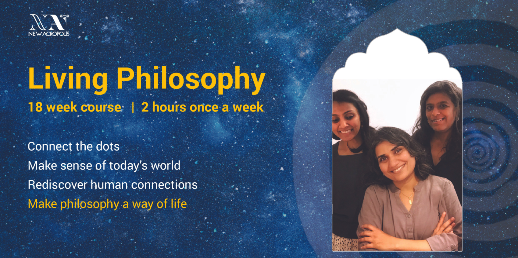 New Acropolis Bangalore - Indiranagar #3017, 12th-B main, Indiranagar, BangaloreJoin us for an intro session to meet the course instructors, learn about the approach, themes, and structure of the Living Philosophy course, and New Acropolis. Over 18 weeks, this [...]