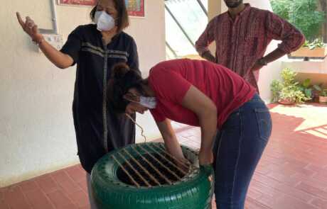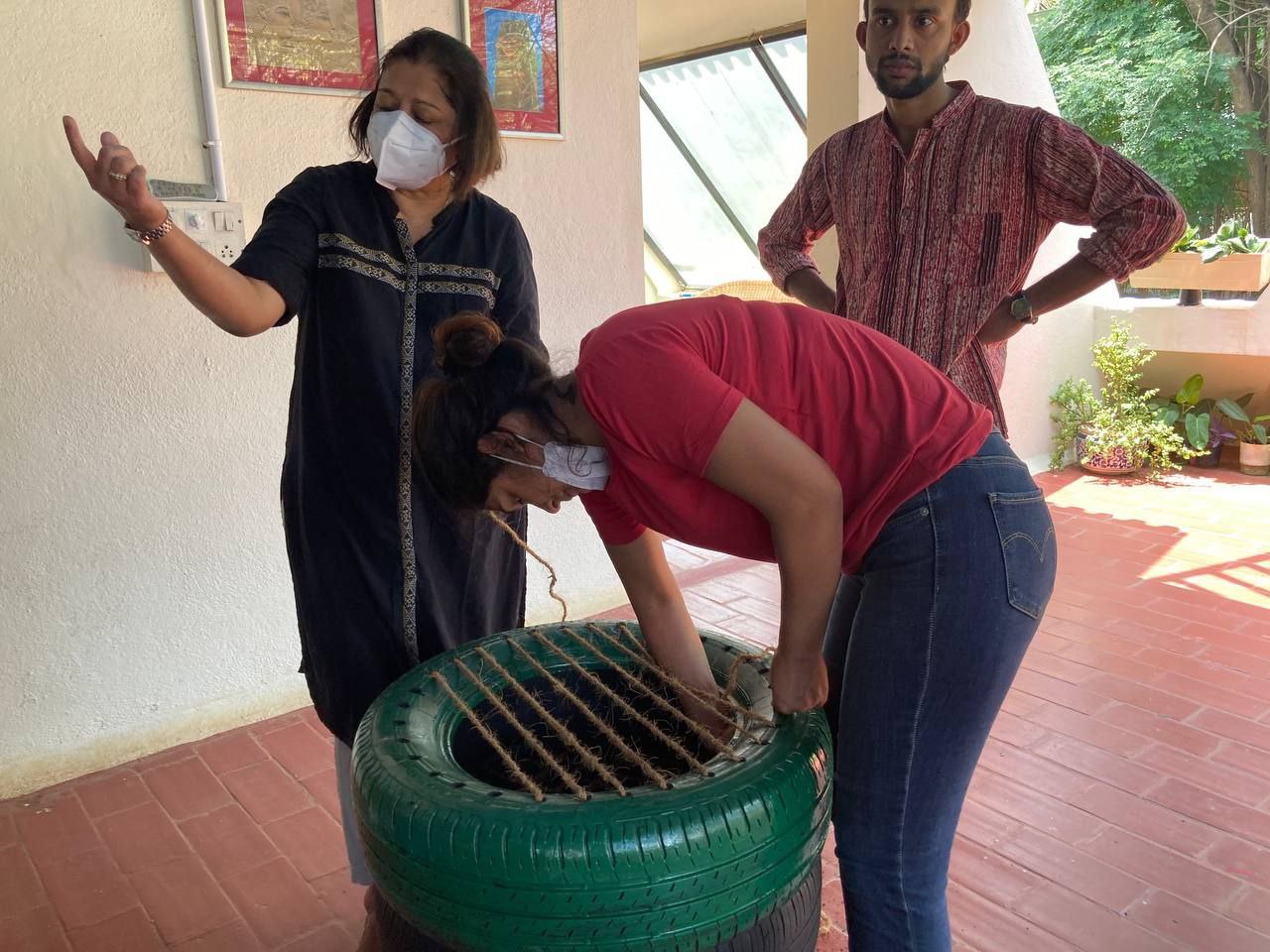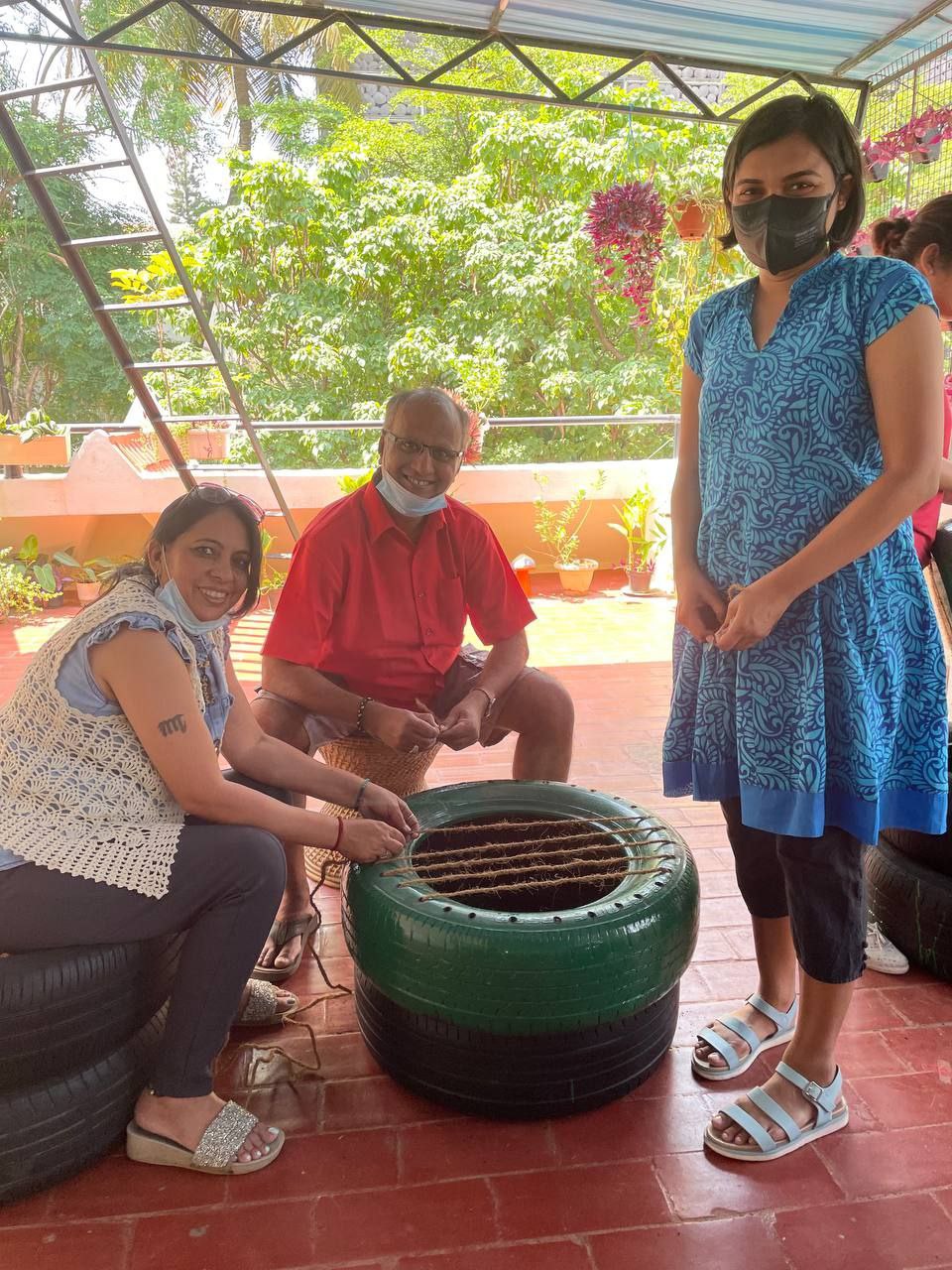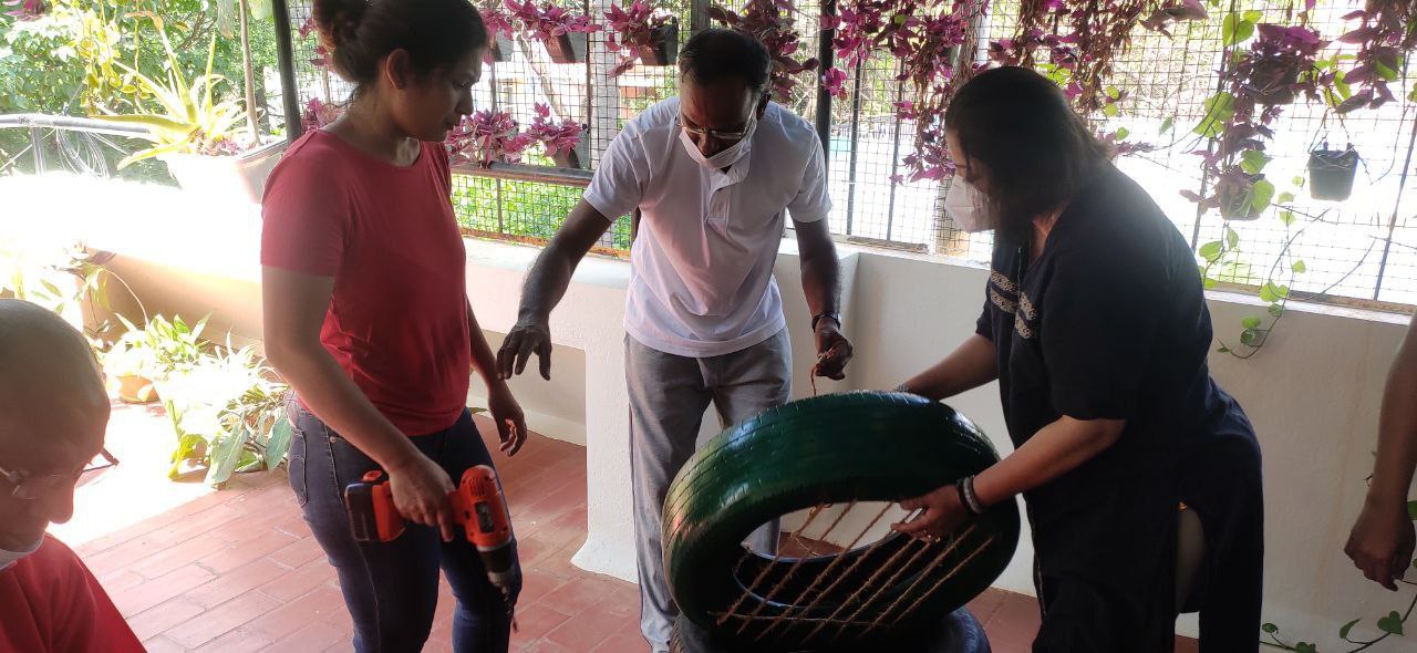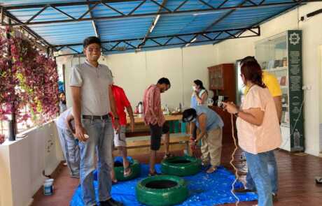 Our philosophical journey found another expression when members & volunteers of New Acropolis India South came together on a beautiful Sunday morning to give new life to used car tyres by upcycling them into seats.