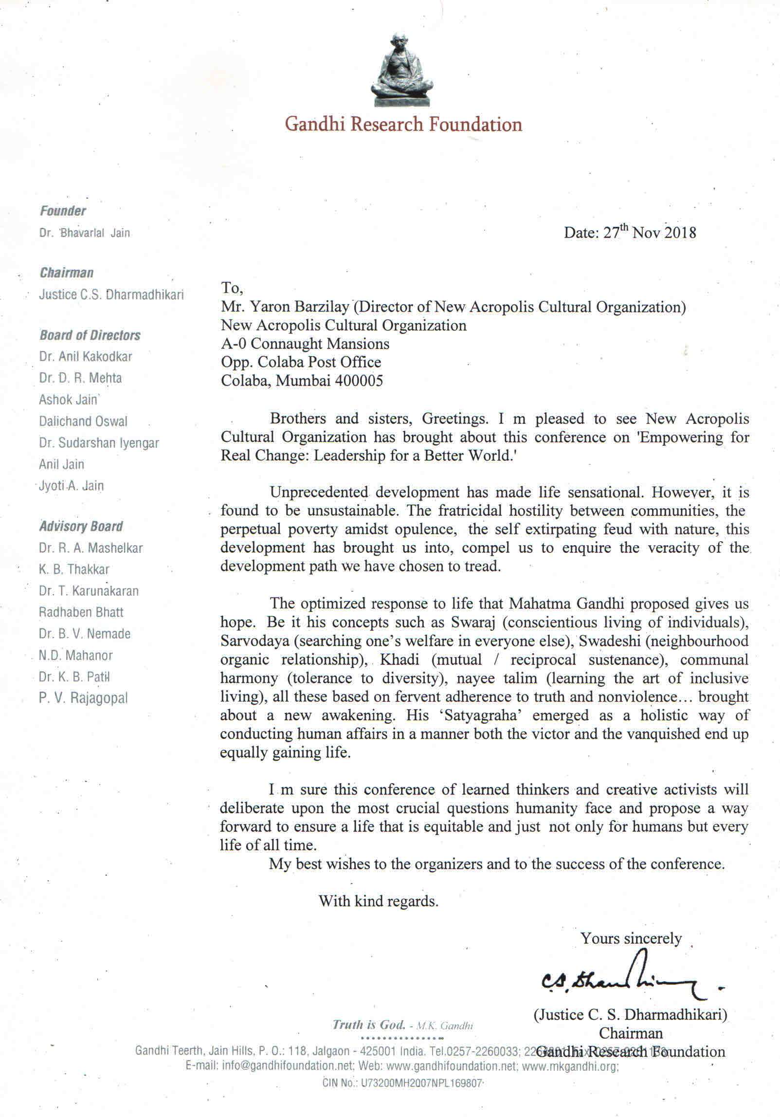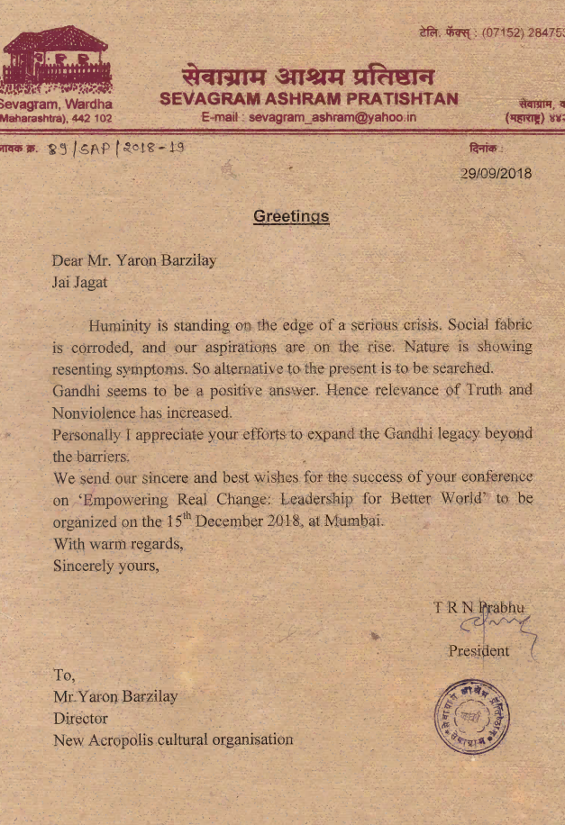 Letter of support from Justice C. S. Dharmadhikari Chairman of the Gandhi Research Foundation for our event Empowering Real Change – Leadership for a Better World