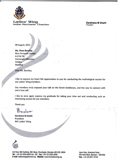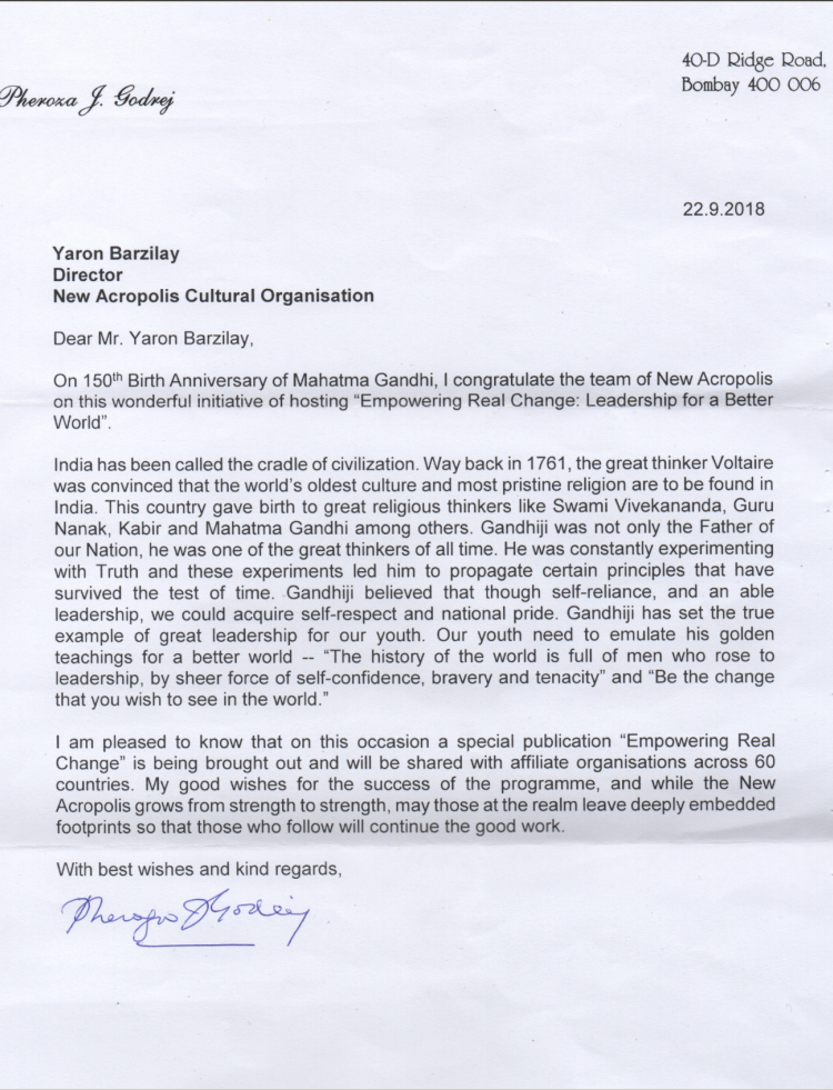 Letter of Support from Smt. Pheroza Godrej for our event Empowering Real Change – Leadership for a Better World