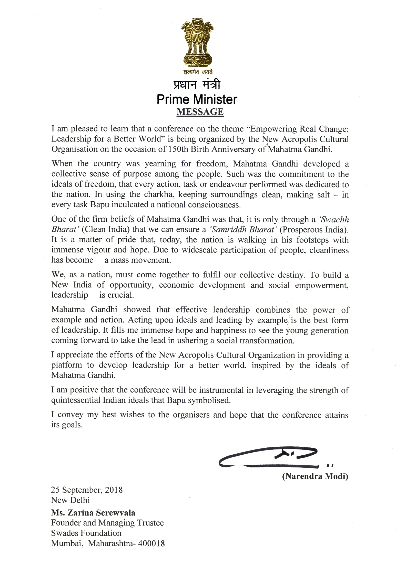 A letter of Appreciation from Honorable Prime Minister (India) Shri. Narendra Modi Empowering Real Change – Leadership for a Better World