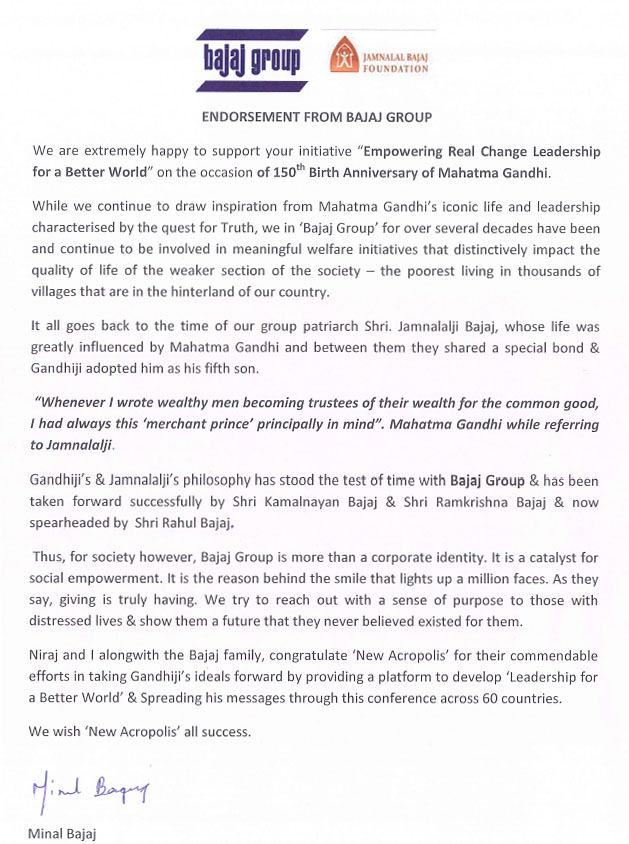 Message of Support from Smt. Minal Bajaj of the Jamnalal Bajaj Foundation for our event Empowering Real Change – Leadership for a Better World