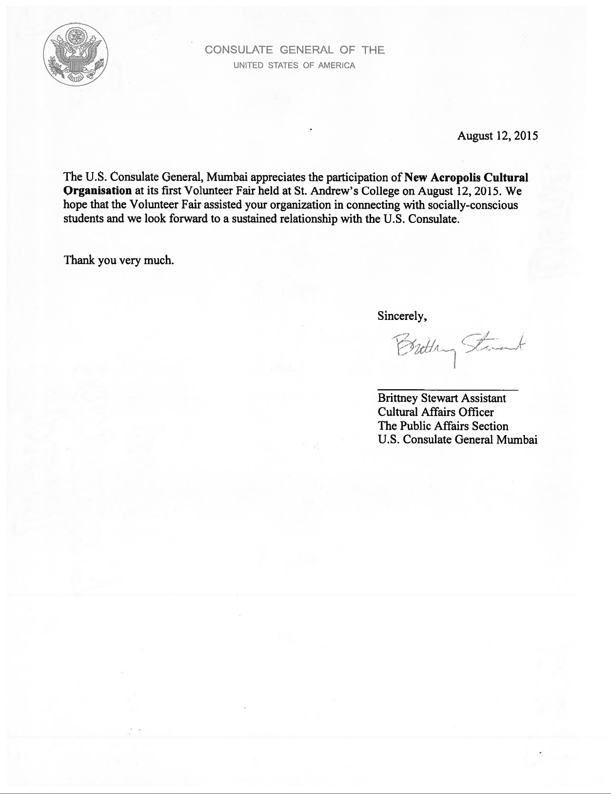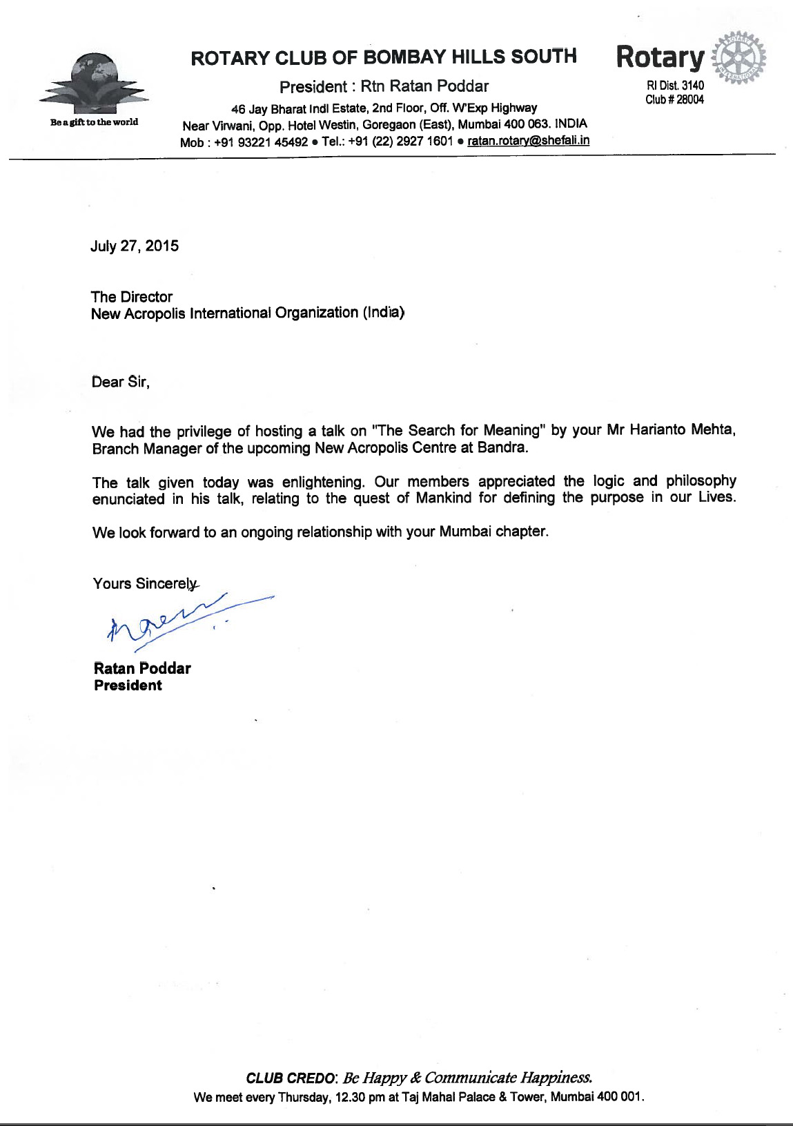 Letter of support from Mr. Ratan Tata Chairman of Tata Trusts for our event Empowering Real Change – Leadership for a Better World